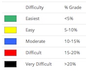 The selected route is displayed using a color code (see legend insert) on road segments to show the road grade, also called slope, incline, or gradient. For example, a grade of 5% is a rise of 5 vertical feet per 100 horizontal feet.