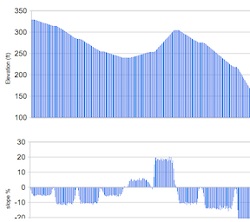 Flattest Route slope elevation graphFlattest Route is a free web application. It is a tool for showing changes in slope and elevation along a route, so you can see where there are hills, mountains, dips and valleys.